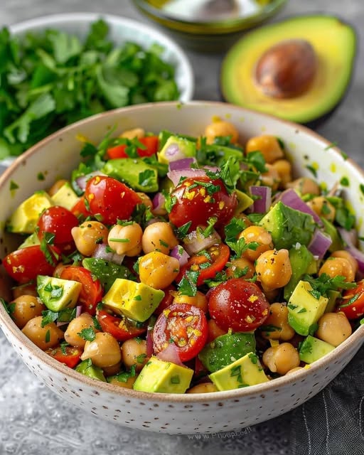 Here is your FULL DETAILED RECIPE for a fresh, healthy, protein-packed Chickpea & Avocado Salad — creamy, crunchy, flavorful, and ready in just minutes! 🥗🥑✨