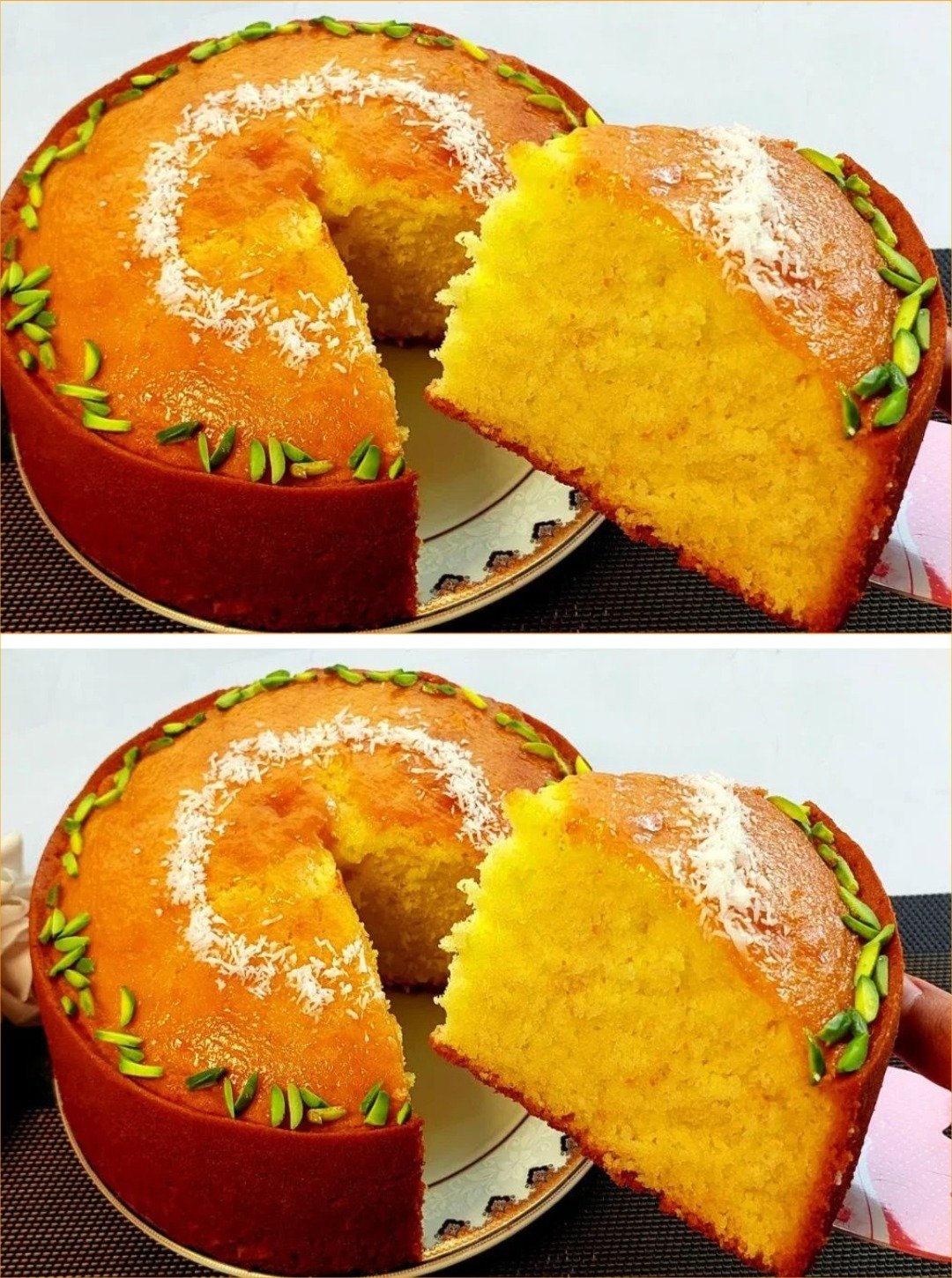 - Brush the top with warm apricot jam and decorate with slices of pistachio and shredded coconut before serving.