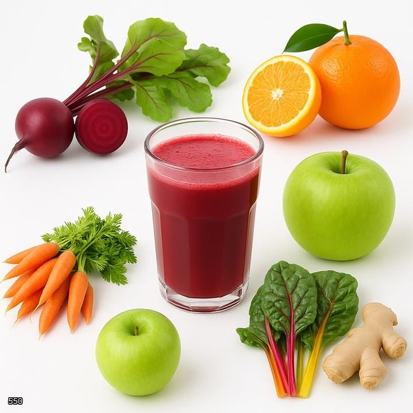 This vibrant juice made from beetroot, carrots, kale, oranges, apple, and