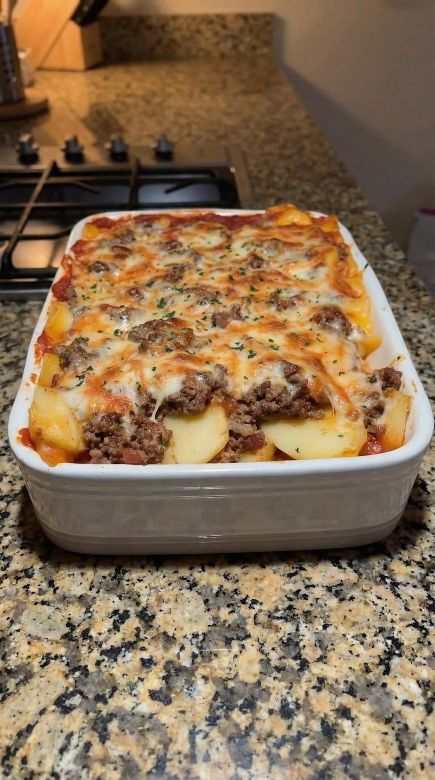 Construct a second layer by arranging the remaining tubers, then covering them with another one-third portion of the soup mixture and the remainder of the meat mixture.