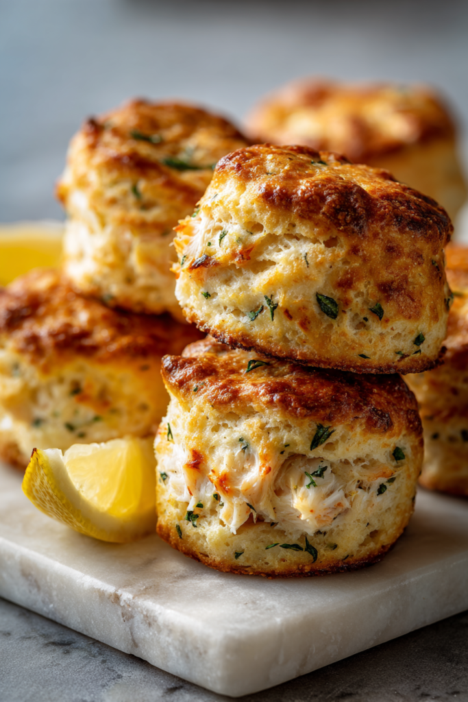 Assemble Biscuits: Scoop about 2 tablespoons of biscuit dough and flatten slightly. Place 1 tablespoon of crab filling in the center. Cover with another tablespoon of dough, pinching edges to seal and form a round biscuit. Repeat until all dough and filling are used.