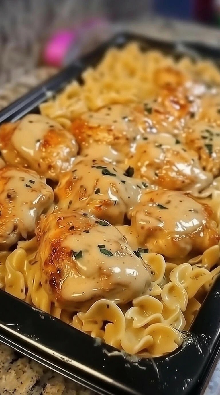 Creamy sauce, tender chicken, and soft noodles create the ultimate comfort food vibe.