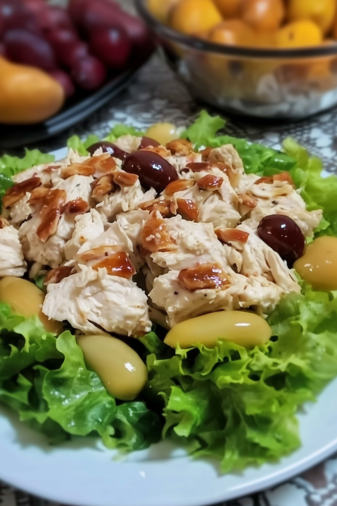 - In a large mixing vessel, combine the shredded fowl meat, dried sweet tart berries, chopped edible tree seeds, slivered tree seeds, crystalline minerals, coarse ground spice, and pungent dried bulb powder.
