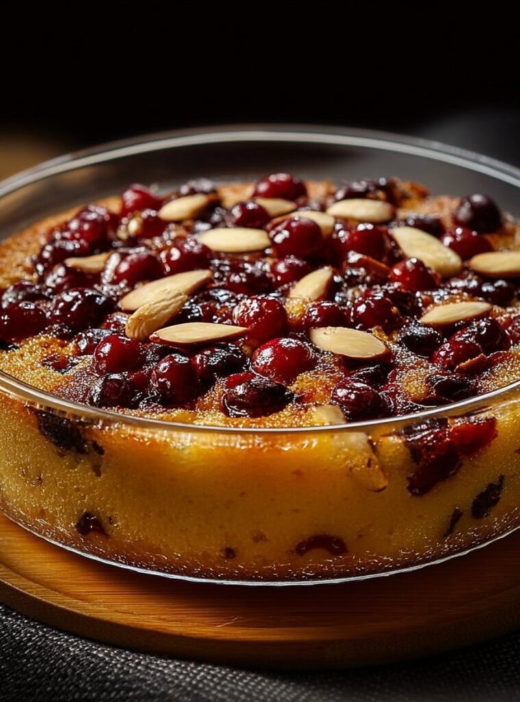 - Pour the batter into the prepared pan. Top it with the drained cranberries and chopped almonds.