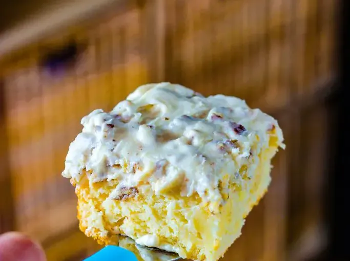 - Stir in the vanilla and crushed pecans and spread the frosting on the cooled cake.
