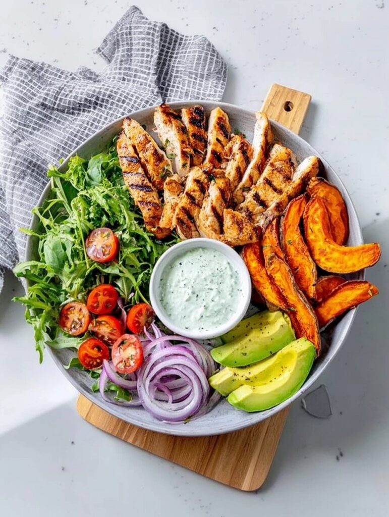 Grilled Chicken with Roasted Sweet Potatoes & Avocado Salad