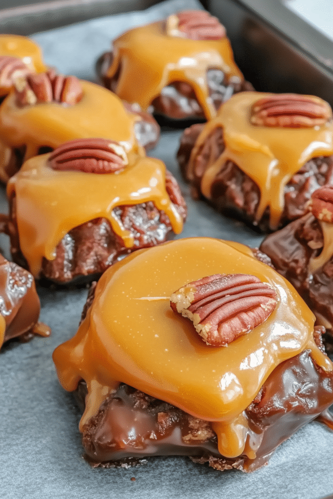 - Top with Caramel: Using a spoon, generously drip the warm caramel mixture directly over the exact center of each group of four pecans on the baking sheet.