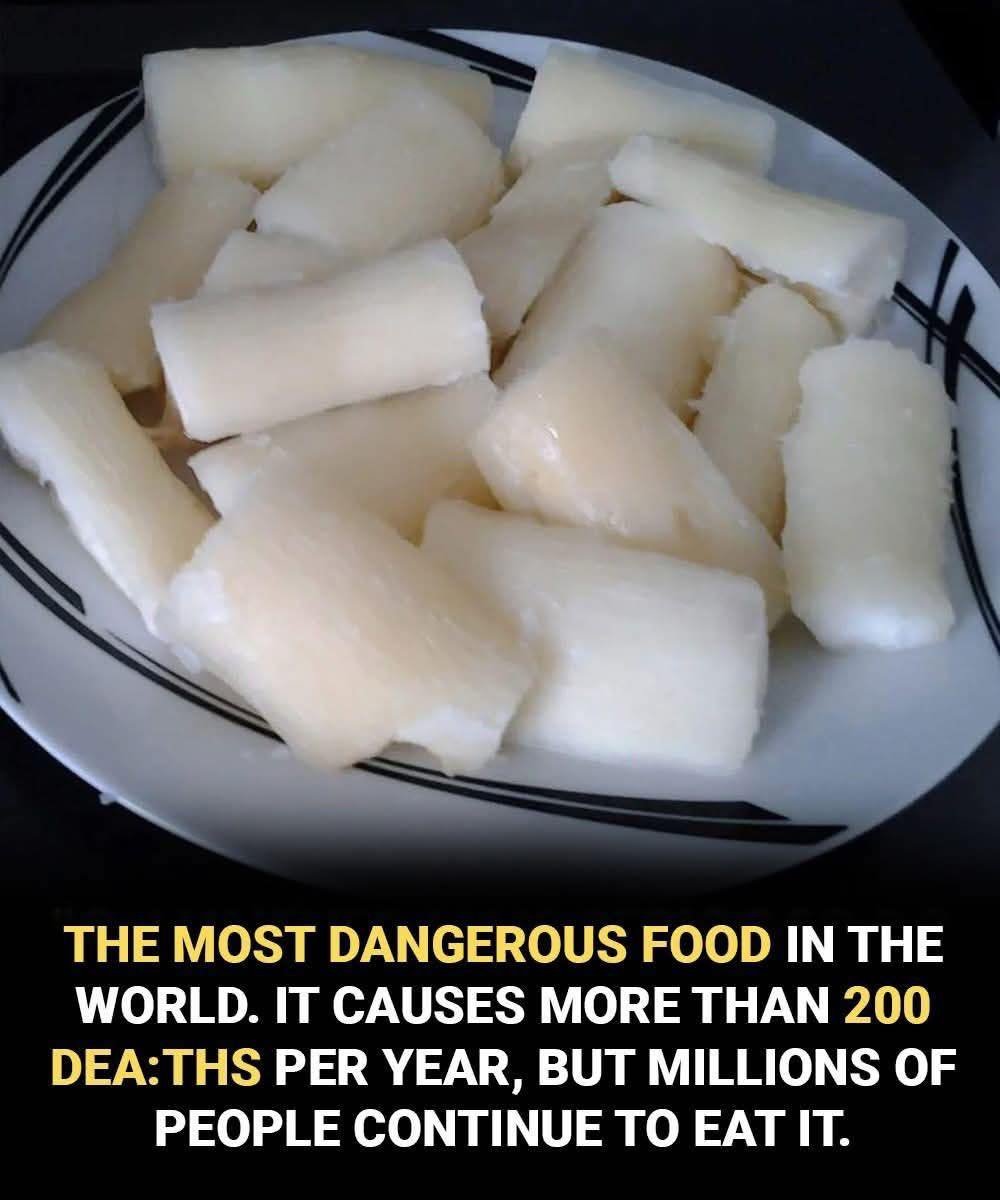 The food in the image is cassava (also known as manioc or yuca), a starchy root vegetable that is a staple in many parts of the world. While it is an essential food source, cassava contains natural cyanogenic compounds that can be toxic if not prepared properly. If consumed raw or improperly processed, it can cause poisoning. However, when prepared correctly (through boiling, soaking, and drying), cassava is safe to eat and can be enjoyed in various dishes, such as fries, stews, or even as flour.