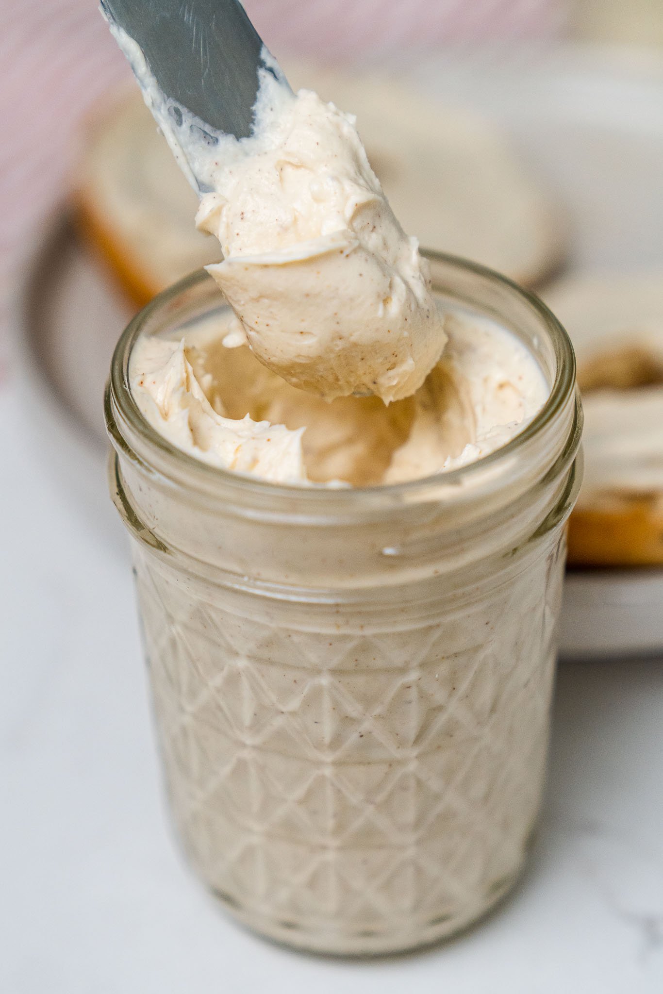 This spread is rich, creamy, and layered with the warm spices and flavor. Maple syrup, cinnamon, and just a hint of cardamom come together for a heavenly blend and a spoonful of powder sugar sweetened it up. Mix all that goodness into two full blocks of cream cheese, then throw in a pinch of salt to balance it out. Whether you’re slathering it on toast, swirling it into oatmeal, or sneaking a spoonful straight from the jar, this spread hits all the right notes.