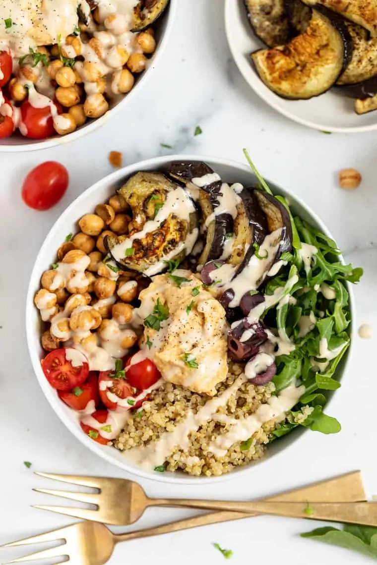 Mediterranean cuisine emphasizes fresh vegetables, legumes (like chickpeas), whole grains (like quinoa), healthy fats (olive oil, olives), and dairy in moderation (feta). Downshiftology+2RecipeTin Eats+2
