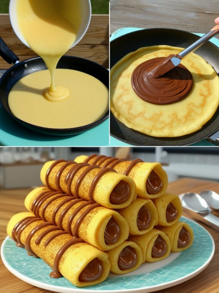 Cook crepes: Heat a non-stick pan, brush lightly with olive oil. Pour a ladle of batter, swirl into a thin circle, and cook until golden on both sides. Repeat.