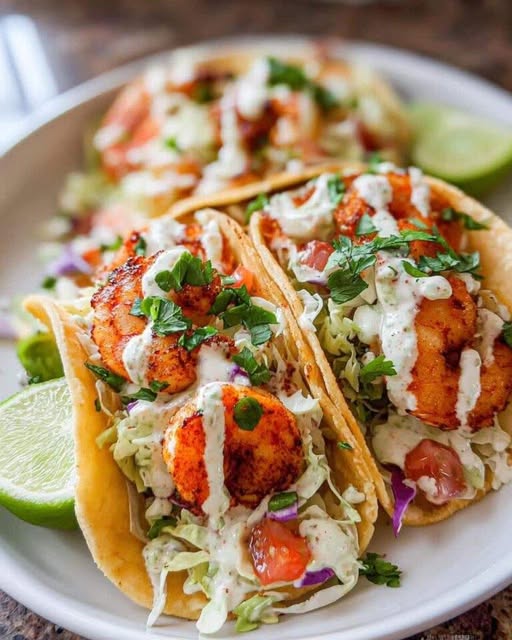 Grilled Shrimp Tacos: Thread shrimp onto skewers and grill over medium heat for 2–3 minutes per side. The smoky flavor pairs beautifully with the creamy slaw.