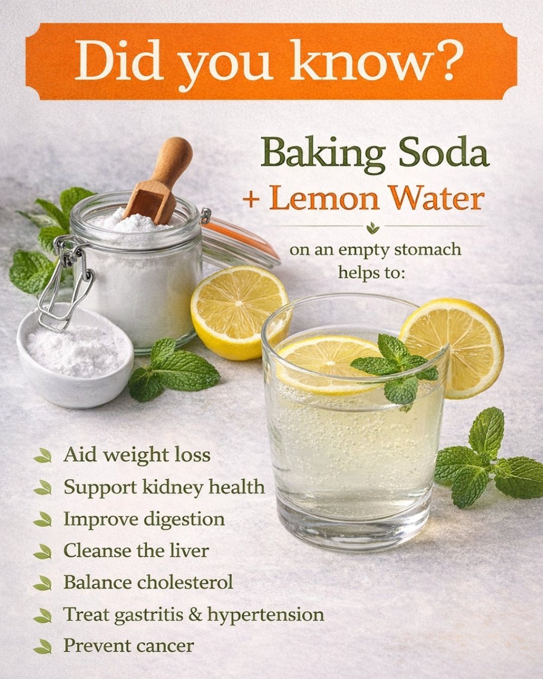 Lemon water mixed with baking soda is a simple home remedy that many people use for digestion and general wellness. It may help neutralize stomach acid, support hydration, and provide vitamin C.