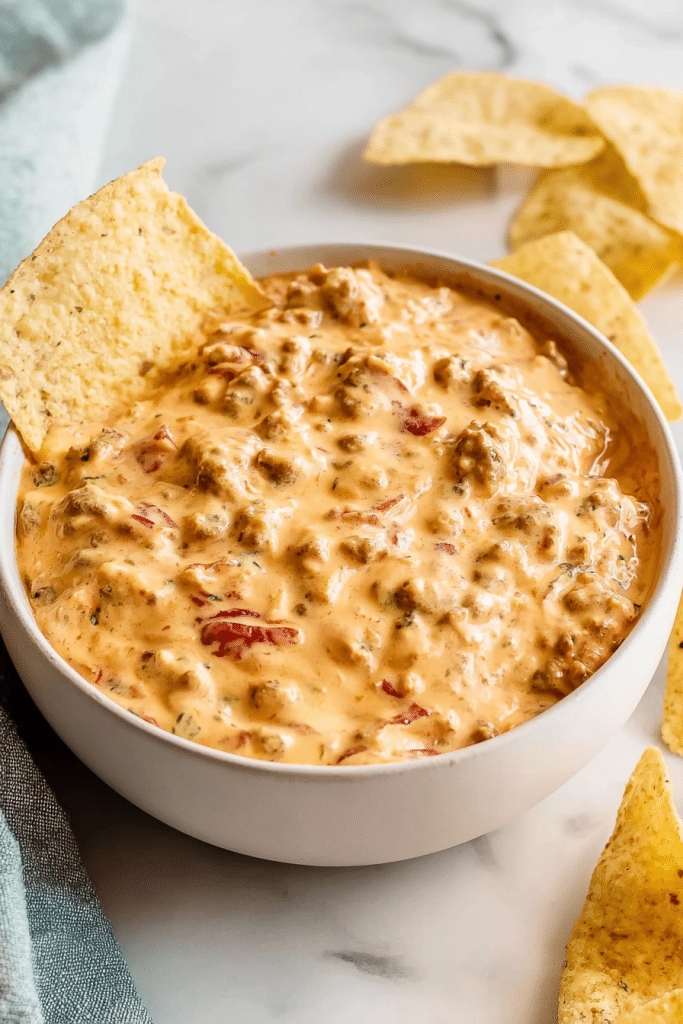 This cheesy sausage dip is ideal for game day, Thanksgiving appetizers, Christmas gatherings, and potlucks.