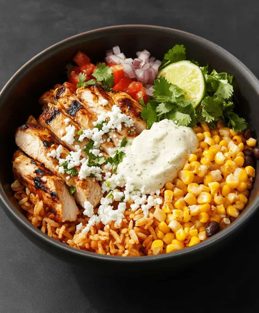 Step 5: Assemble the Bowls Divide the warm rice between four serving bowls. Top each bowl with sliced chicken, seasoned corn, black beans, diced red onion, and diced tomatoes. Drizzle generously with the lime crema and sprinkle with crumbled cotija cheese and fresh cilantro.